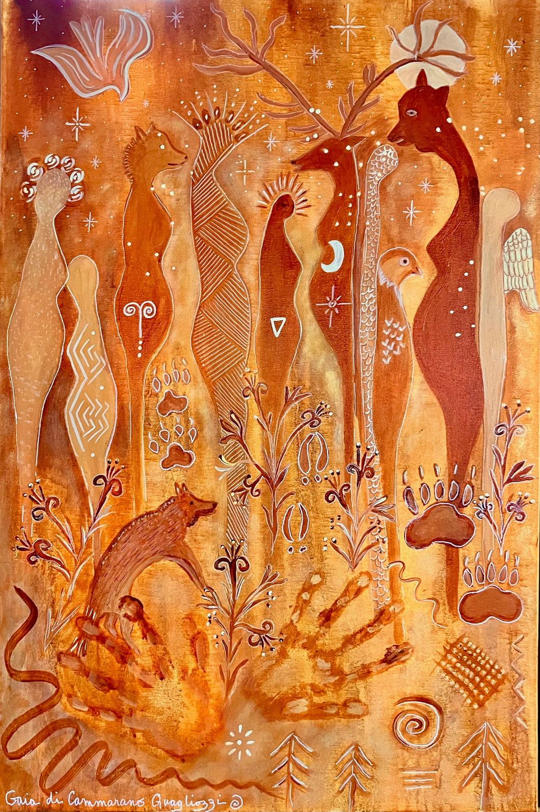 This painting is both a ceremonial story-map reminding us of a time when myth, dream, and ecology were one and a visual prayer - an invocation of the old ways, when people lived in reverent relationship with the land, the animals, and the stars above.