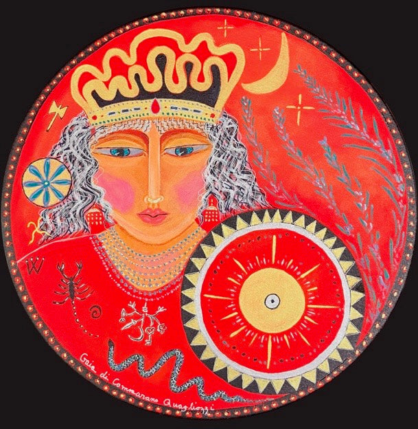 Her dress is adorned with sacred symbols: the scorpion, serpent, spiral, and the Marian emblem of protection. Above her, the crescent moon and star lend their blessings.